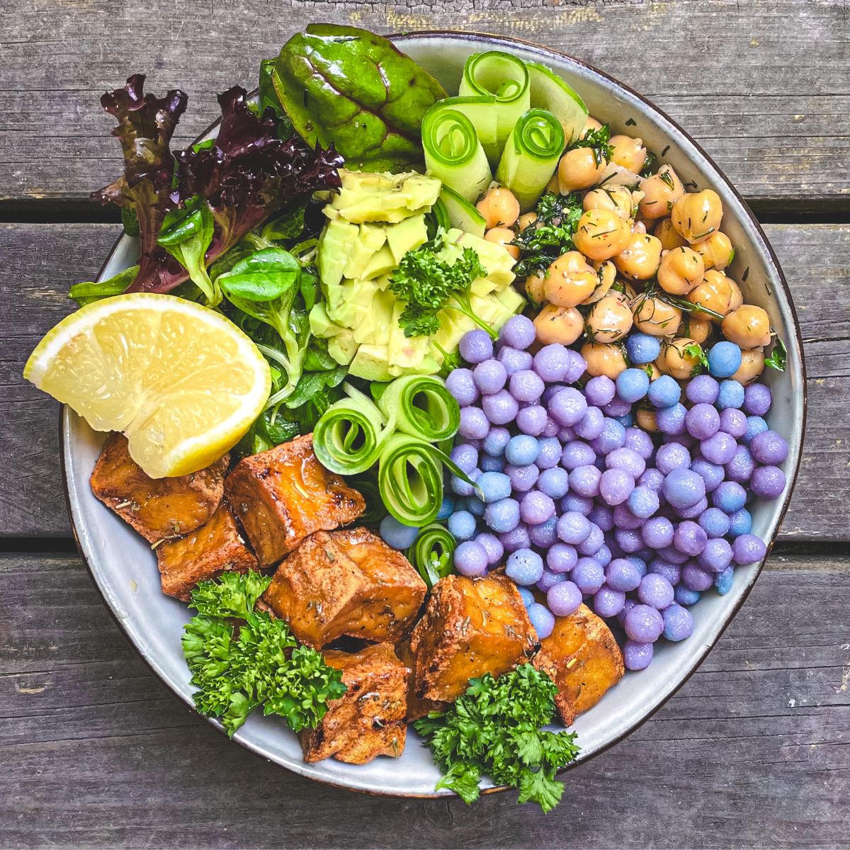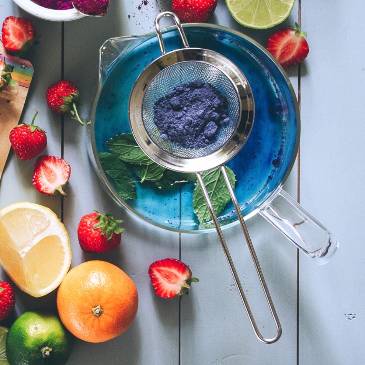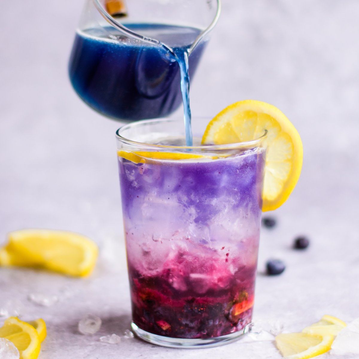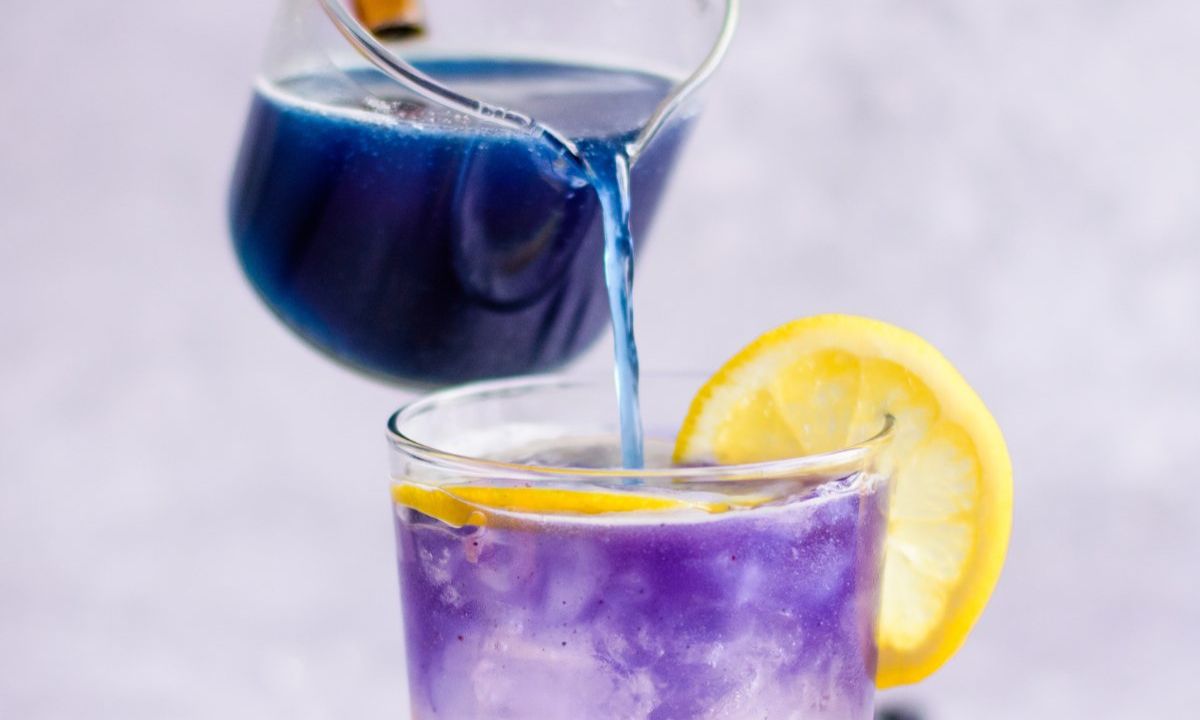 ✨ Rör ner i en fruktinfuserad dryck för en härlig blå ton – tillsätt sedan citronjuice för att få den att skifta från blå till lila.
